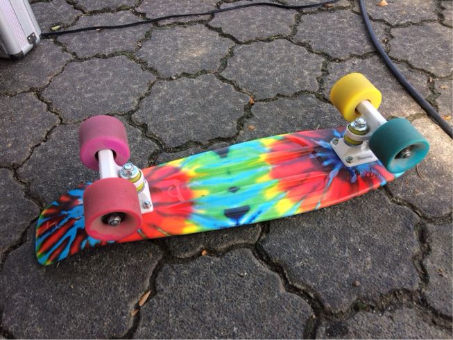 大道芸には全然関係ないですが、最近スケボーのペニーというやつを買いまして、芸の合間に駐車場で遊んでます。